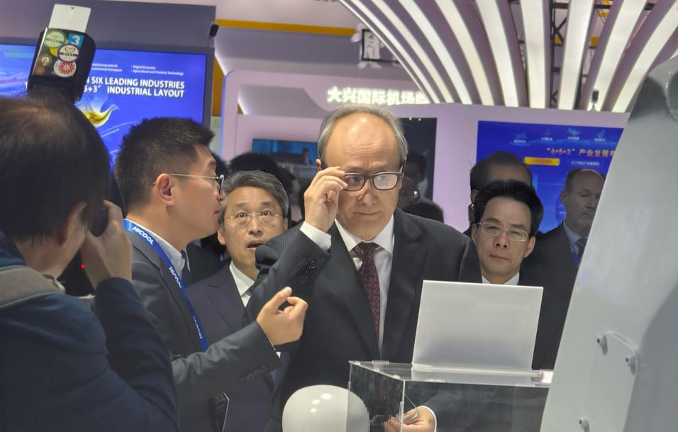 2025年10月16-18日,HICOOL全球创业者峰会在北京举行,北京市委书记尹力出席并调研顺义展区阿法龙展台,试戴AR眼镜,肯定其轻量化与实时翻译、提词、警务人脸识别、工业巡检等功能。阿法龙Alpha S10警务系统已获公安部认证,多地公安落地;Alpha Vision MR工业系统可降30%停机时间。